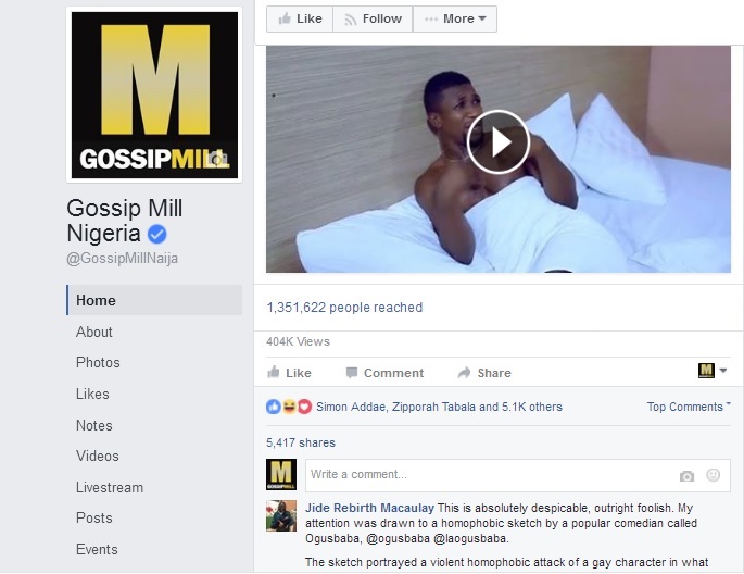 This is absolutely despicable, outright foolish. My attention was drawn to a homophobic sketch by a popular comedian called Ogusbaba, @ogusbaba @laogusbaba.The sketch portrayed a violent homophobic attack of a gay character in what is titled Lekki Gay.We all have a sense of humour, however this sketch does more than create laughter. It glorifies and glamorises homophobic attacks faced daily in reality for many LGBT people in Nigeria.I am consulting with my colleagues both at home in Nigeria and anywhere else so we can take action.We would also seek to intercept any foreign plan programme, as I understand that Ogusbaba tours America and Europe frequently.Ogusbaba need to understand that this is not funny. Your comedy is giving licence to haters to attack gay people. If you don’t like same sex, then don’t have sex with someone of the same sex.Unfortunately, Nigeria currently have laws against consenting same sex between adults.We urge Ogusbaba to withdraw this sketch, apologise to the gay community and condemn any homophobic abuse as a result of this comedy.Contact @revjide, @houseofrainbow,Gossip Mill, please kindly delete this video from your page.